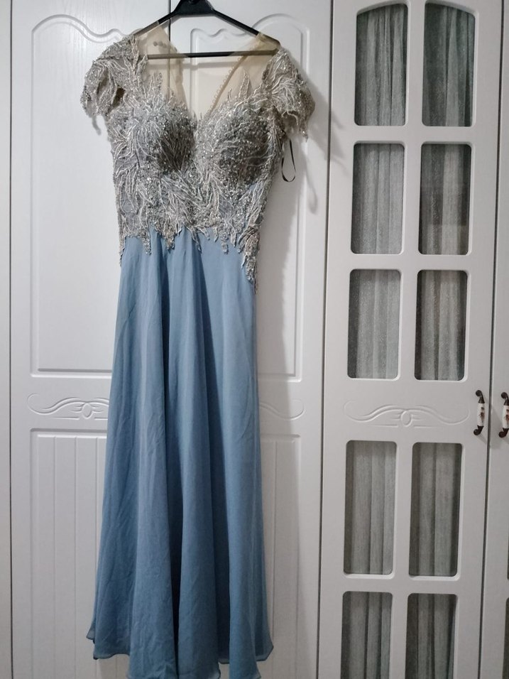 Nakışlı Mavi Uzun Abiye Elbise
