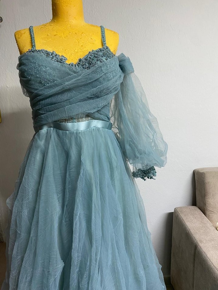 Bu mavi, nakışlı, drapeli ve askılı detaylara sahip uzun nişan elbisesi, vintage bohem tarzıyla düğünlere uygundur.