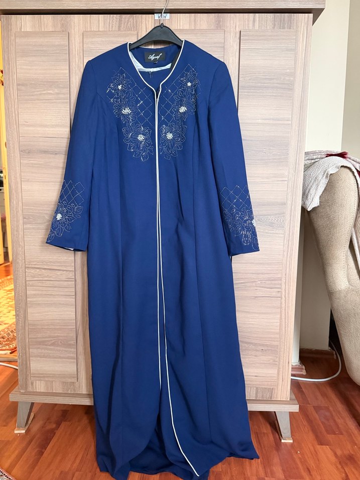 Mavi uzun elbise, yakasında çentikli yaka ve ön ile kollarda nakış detaylarına sahiptir. Regular kesim, drapeli ve uzun kolludur. deformesi yoktur 48 bedendir.