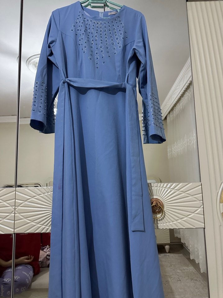Mavi renkli, uzun kollu ve nakışlı detaylara sahip abiye elbise. Beli drapeli kemerle tamamlanmış, düğünler için uygun bir model. ✨