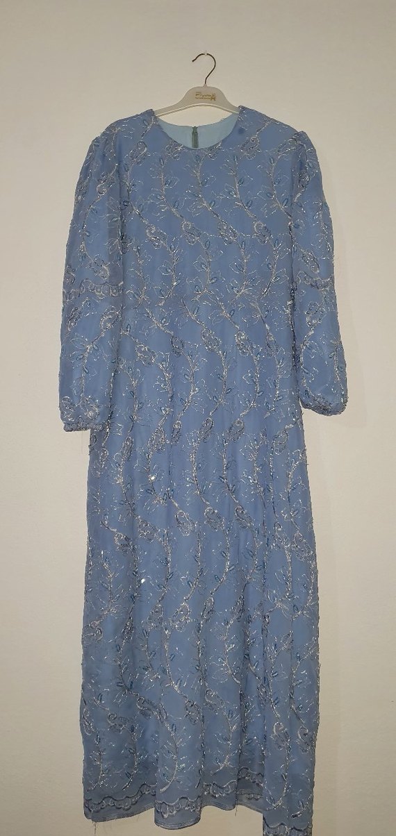 Nakışlı detaylara sahip mavi uzun elbise, uzun kollu ve kayık yaka ile bohem vintage tarzını yansıtır. Dökümlü ve rahat kesimdir, düğünler için uygundur.