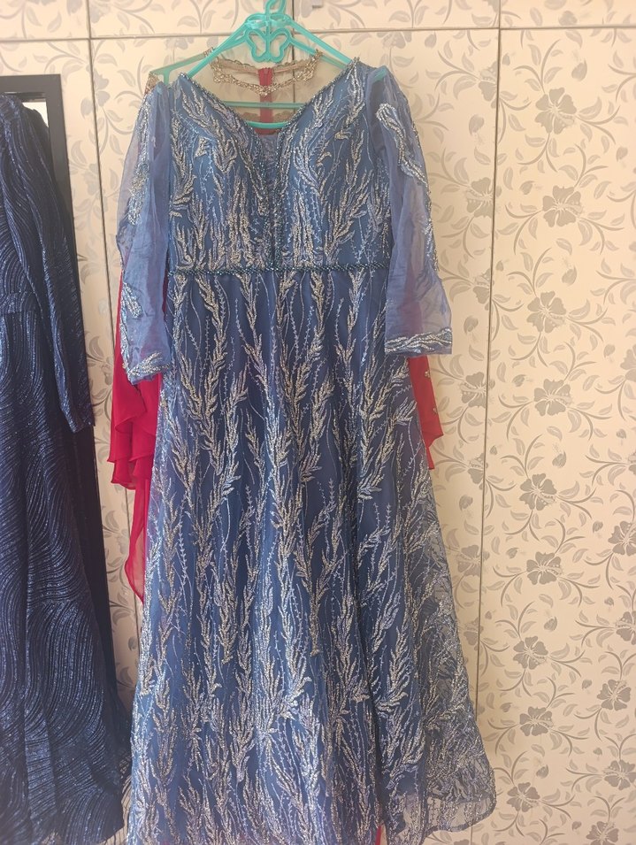 Nakışlı, drapeli kumaştan yapılmış uzun ve bol kesim elbise. Uzun kollu ve V yakalı, düğünler için uygun.