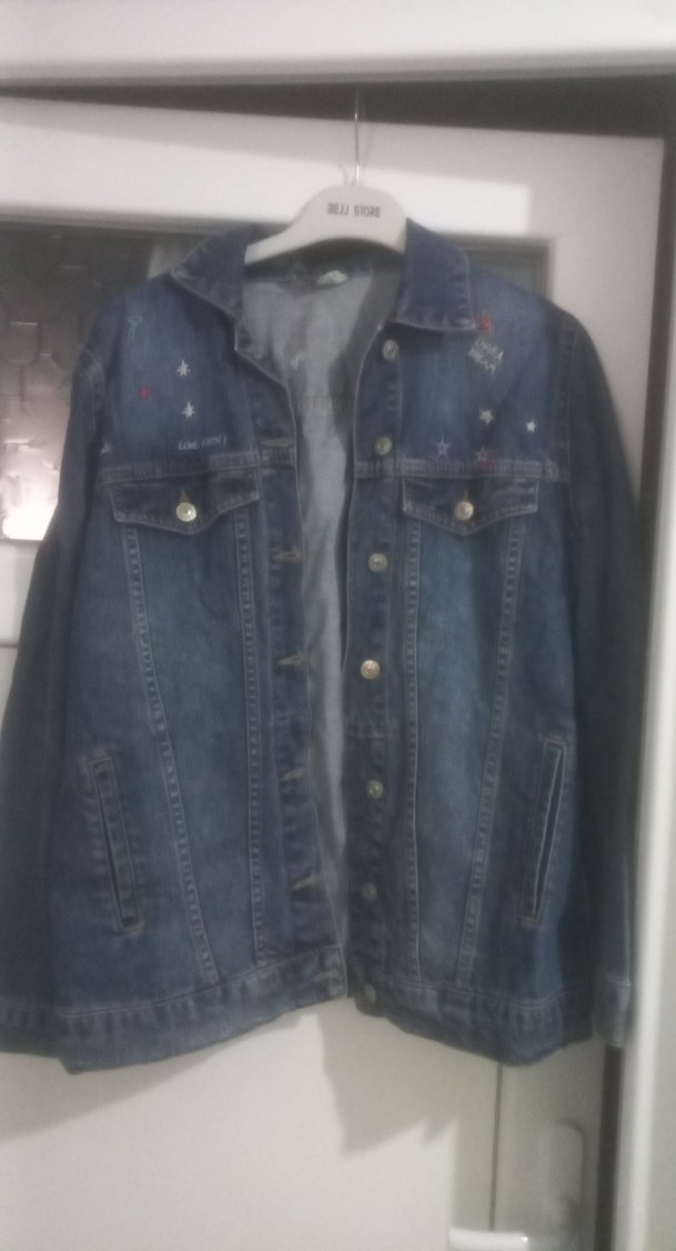 Düğmeli, notalı yaka ve nakışlı detaylara sahip bol kesim denim ceket. Uzun kollu, parlak mavi renkte, günlük sokak tarzına uygun.