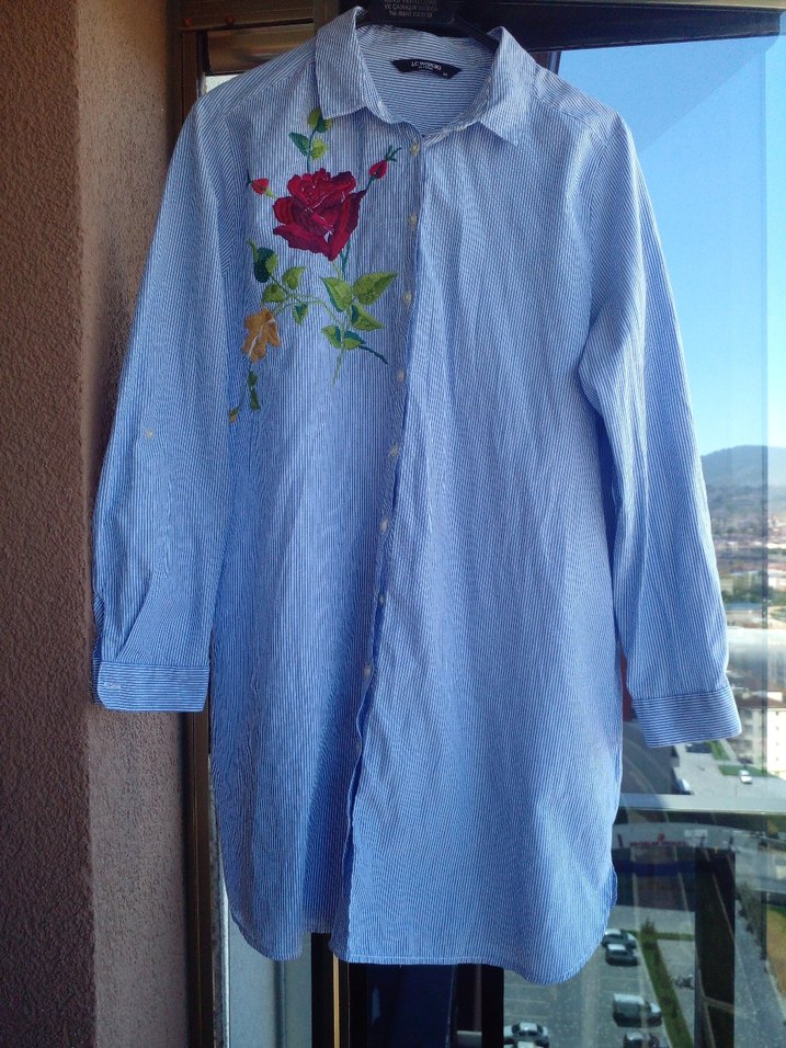 Nakışlı Mavi Uzun Kollu Kadın Gömlek