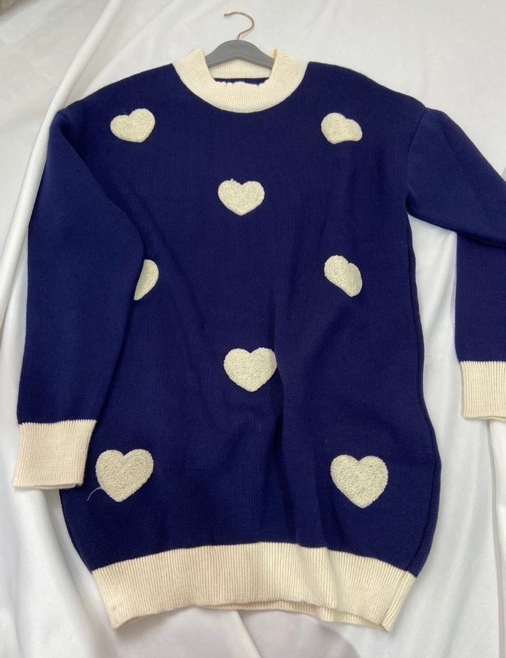 Nakışlı krem kalp desenli, mavi, uzun kollu, yuvarlak yaka, bol kesim triko kazak. Krem ribana manşet ve etek ucu bulunur.