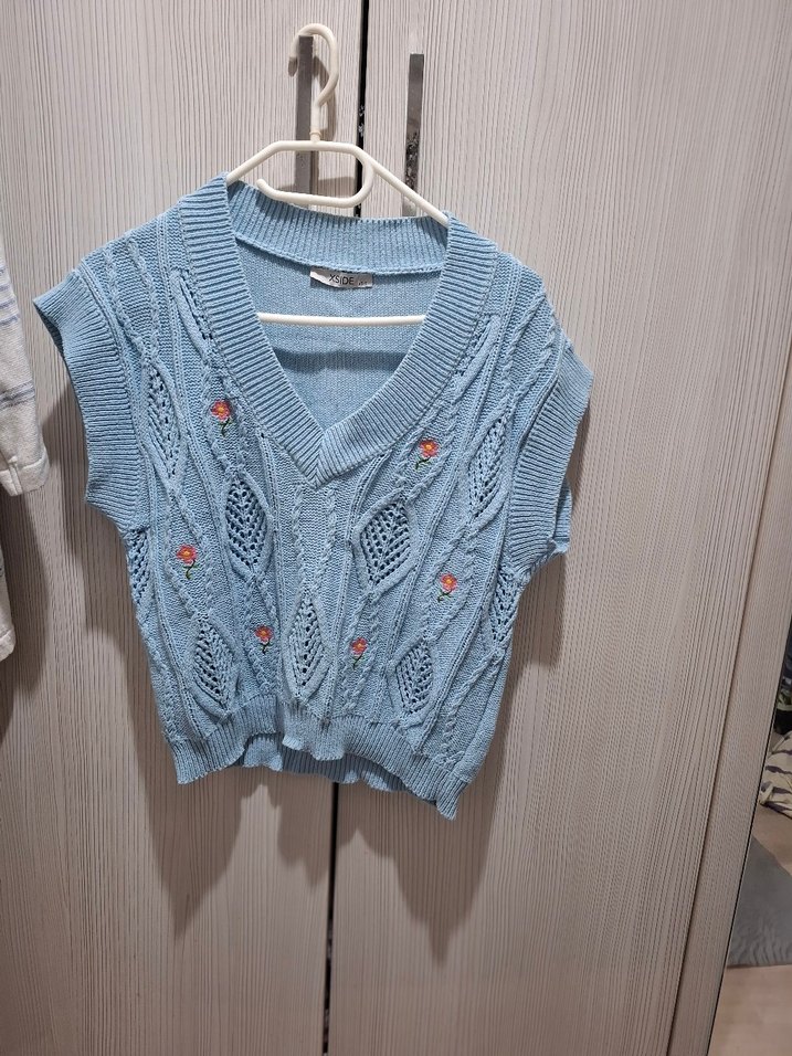 Pastel mavi renkte, V yaka ve nakışlı desenlere sahip, kısa ve kolsuz, bol kesim örme süveter. Günlük sokak stiline uygun rahat bir parça.
