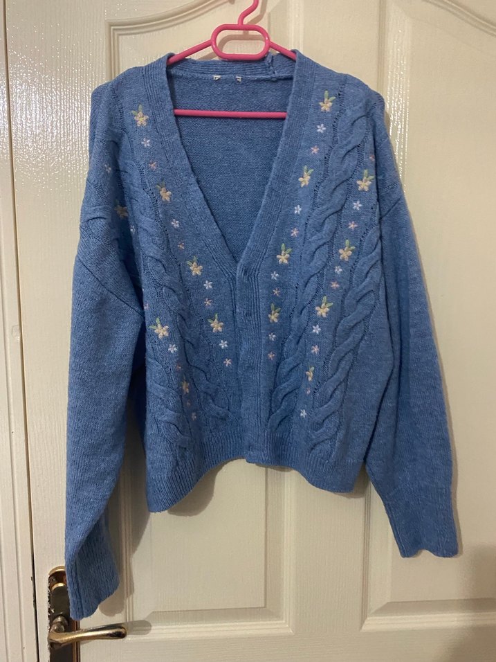 Mavi renkte, V yaka ve ön kısmında nakışlı çiçek desenleri olan triko hırka. Uzun kollu, bol ve midi boyda rahat bir kesime sahiptir.