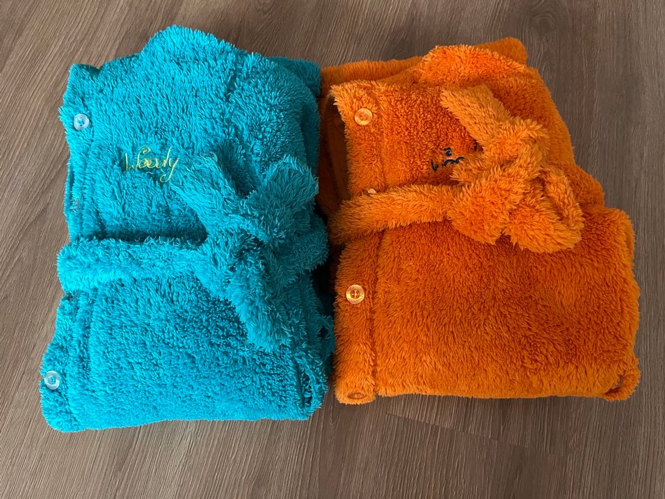 Nakışlı detaylara sahip, parlak mavi ve turuncu tonlarında renkli çocuk sabahlıkları. Yumuşak ve konforlu kumaşla rahatlık sağlar. 10 yaş.