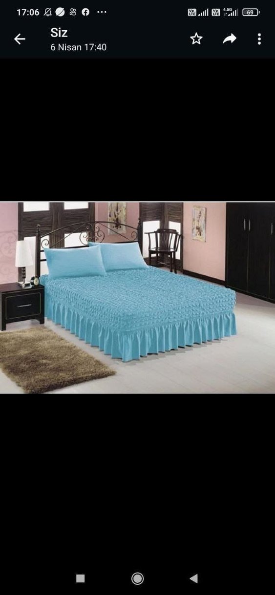 Nakışlı detaylara sahip pastel mavi yatak örtüsü, yanları örten pileli tasarımıyla birlikte gelir. Uyumu tamamlayan yastık kılıfları dahildir. ️