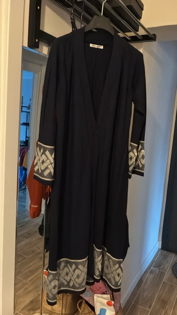 Siyah uzun kadın sabahlık, bol kesim ve nakışlı desenlere sahip. Kollarda ve etek ucunda bohem tarzı detaylar bulunur.
