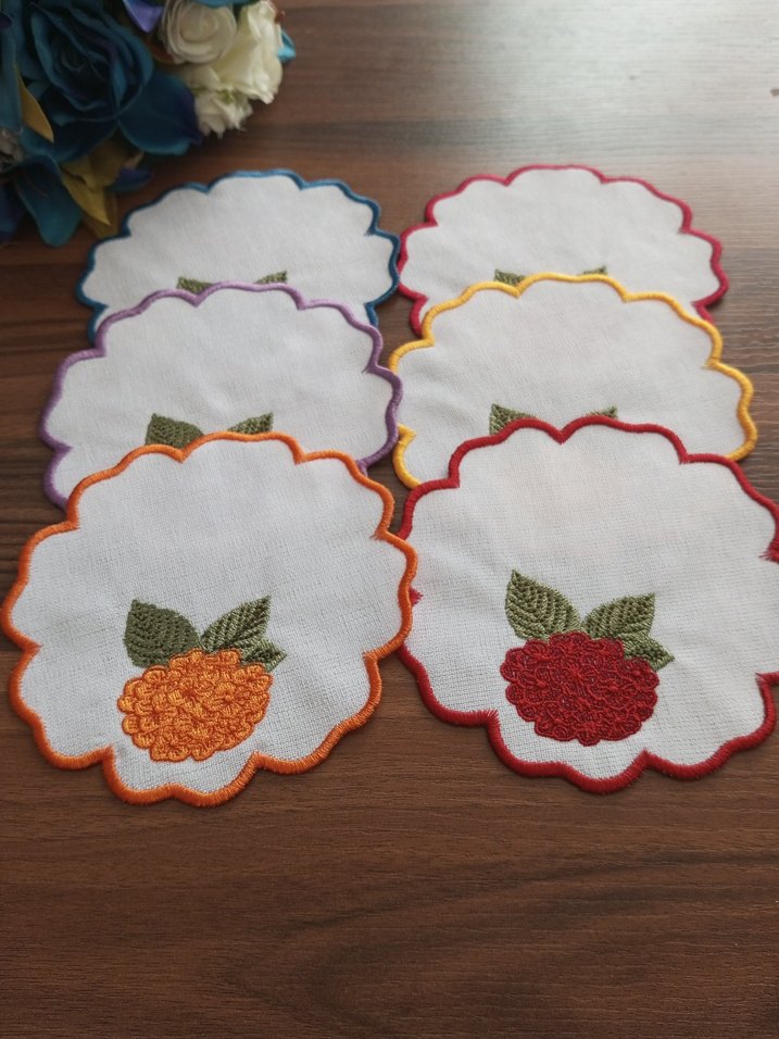 Farklı renklerde, meyve desenli nakışlı ve dalgalı kenarlı bardak ve kahve altlıkları seti. 6 Adet fiyatı 210 TL dir