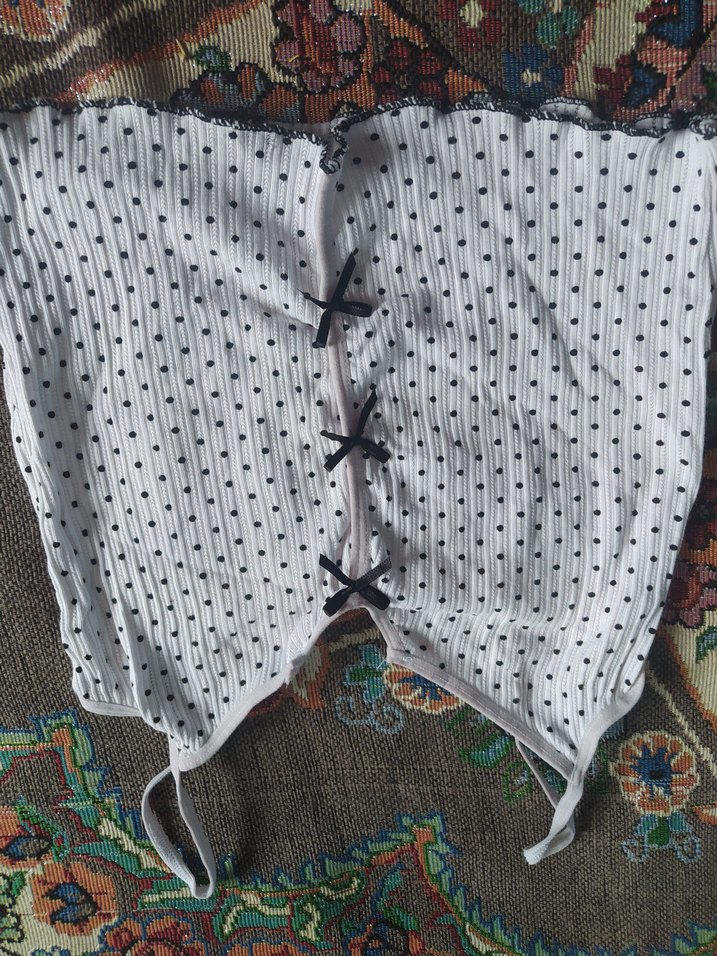 Nakışlı detaylara sahip, beyaz ve gri puantiyeli kısa boy, vücuda oturan atlet Önde ayarlanabilir siyah kurdele bağcıkları bulunur.