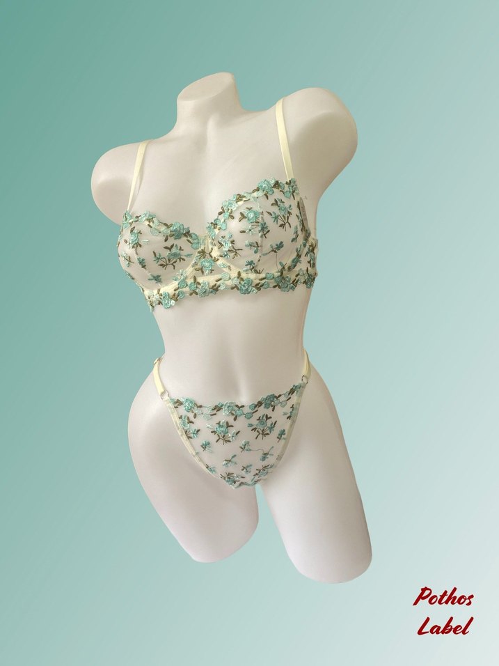 Nakışlı desenlere sahip pastel beyaz kısa uzunlukta sütyen. Bohem Paris tarzını yansıtan ve "Pothos" etiketi bulunan ürün. 75 bedeni mevcuttur.