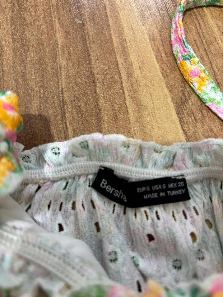 Nakışlı, düğmeli, ince askılı, tekne yakalı, mini boy, bohem tarzda, sentetik kumaştan kadın büstiyer.