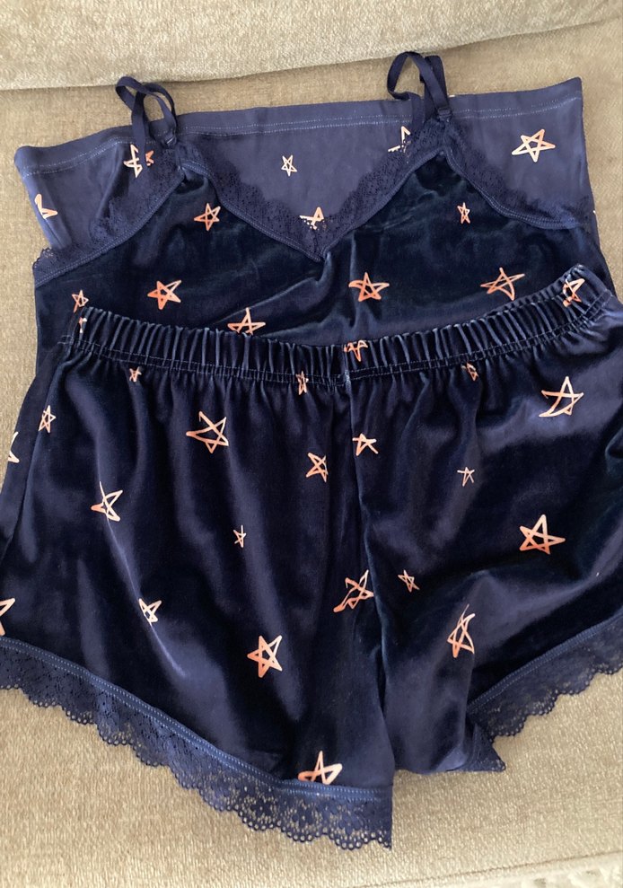 Nakışlı yıldız desenli, ip askılı kısa mavi pijama takımı. Rahat ve bol kesim, dantel detaylı hiç giyilmedi