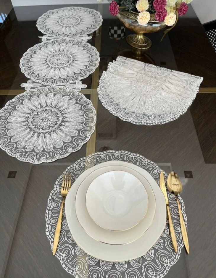 Beyaz tonlarda nakışlı modern klasik masa örtüsü seti, zarif bir masa düzeni için detaylı desenlere sahiptir. ️6 kişilik 7 parça ölçüleri 40x40