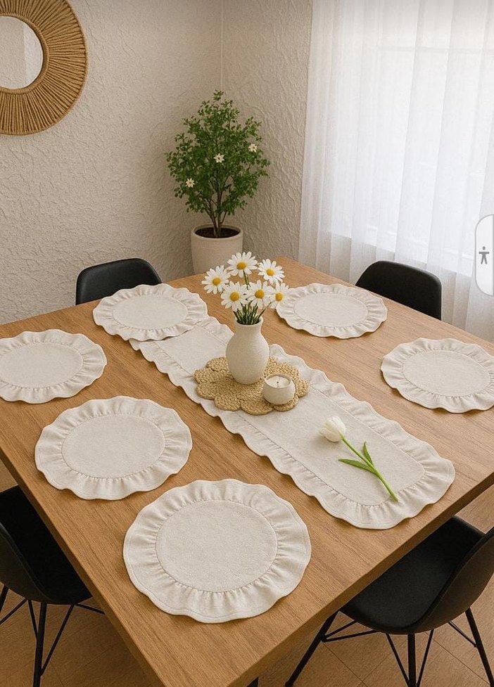 Nakışlı, pastel tonlarda beyaz masa örtüsü seti, modern klasik tarzda, peçeteler ve masa koşucusu ile tamamlanmıştır.