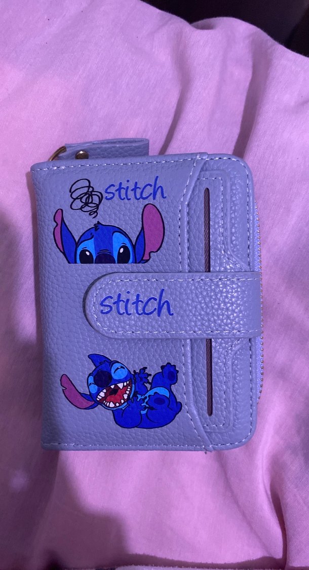 Nakışlı Stitch figürlü mor deri cüzdan, fermuarlı kapanışlı, rahat sokak stili ve günlük kullanıma uygun. yumuşak deri, ekstra kartlık mevcut görsele ekledim