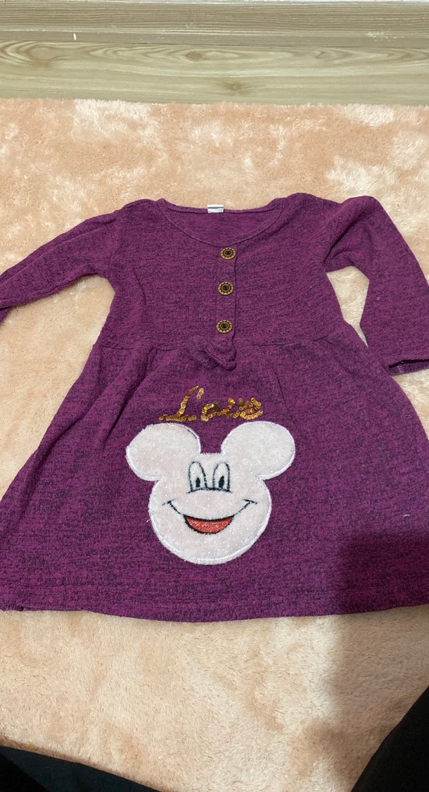 Mor renk, uzun kollu triko kız çocuk elbise. Nakışlı ve renkli desenli, bol kesim, yumuşak ve sıcak kumaştan üretilmiştir.