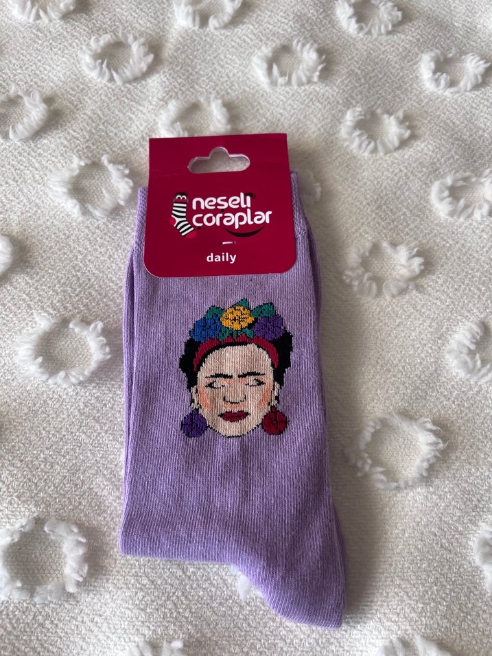 Pastel mor renkte, yumuşak örme kumaştan yapılmış, nakışlı renkli yüz deseni bulunan kız çorabı. Günlük kullanım için uygundur.