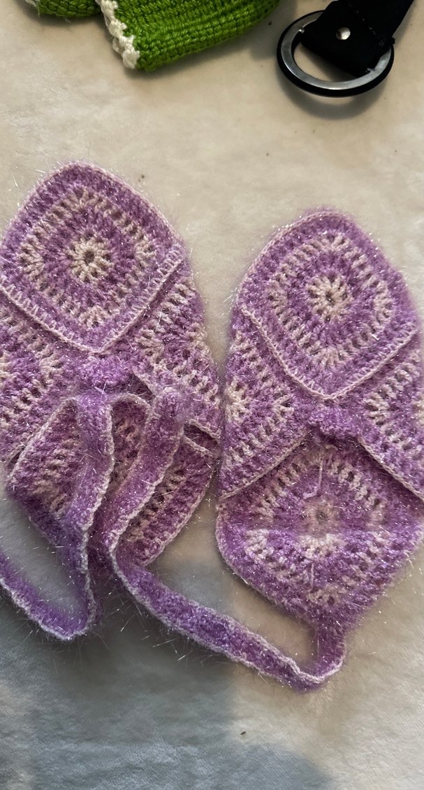 Nakışlı bohem desenlere sahip, pastel mor renkli örgü kız eldiveni, yumuşak ve rahat bir dokunuş sunar.