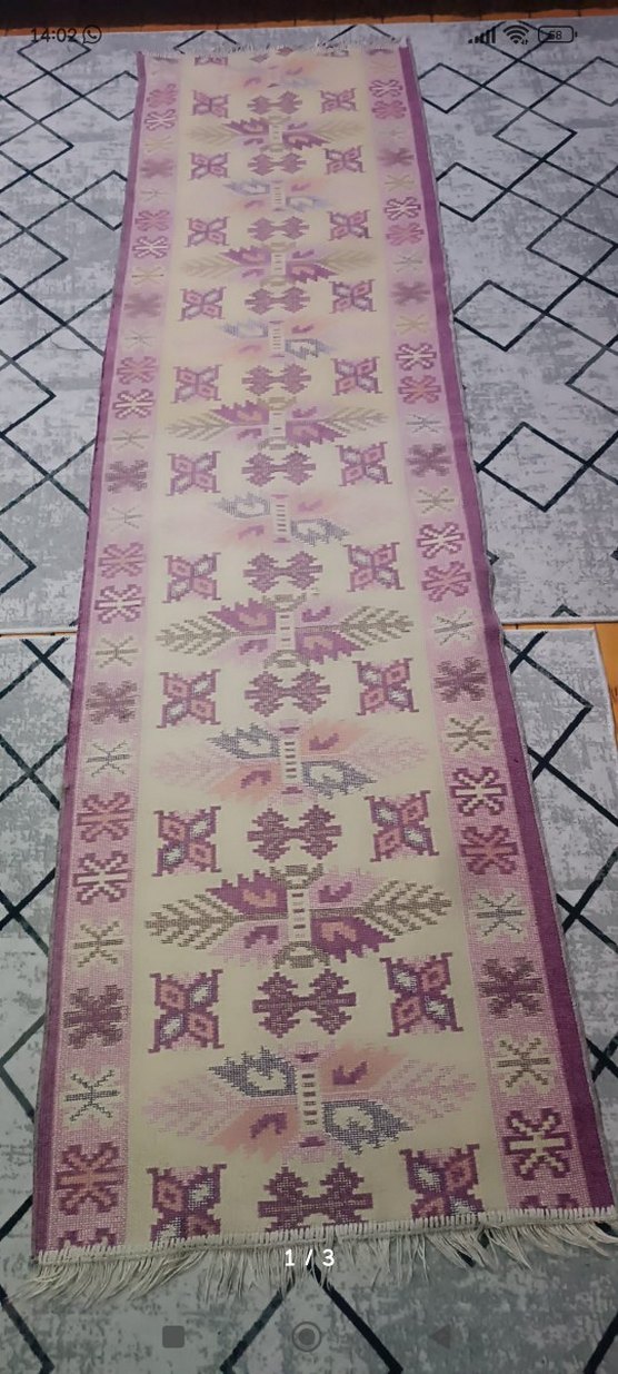 Nakışlı desenlere sahip, pastel mor tonlarında konvansiyonel halı. İnce tasarımıyla mekana zarif bir dokunuş sağlar. OCR: "xxx xX X4X".