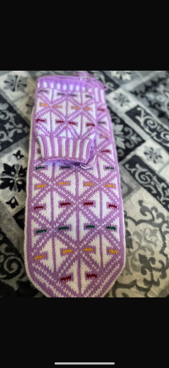 Pastel mor renkte, nakışlı desenlere sahip namaz çorabı i, hem şık hem kullanışlıdır.