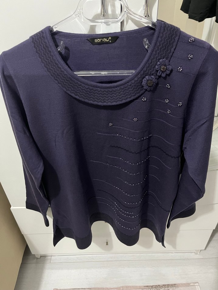 Mor renkli, yuvarlak yakalı ve uzun kollu örgü bluz. Nakış detayları ve normal midi boyuyla günlük kullanıma uygundur.