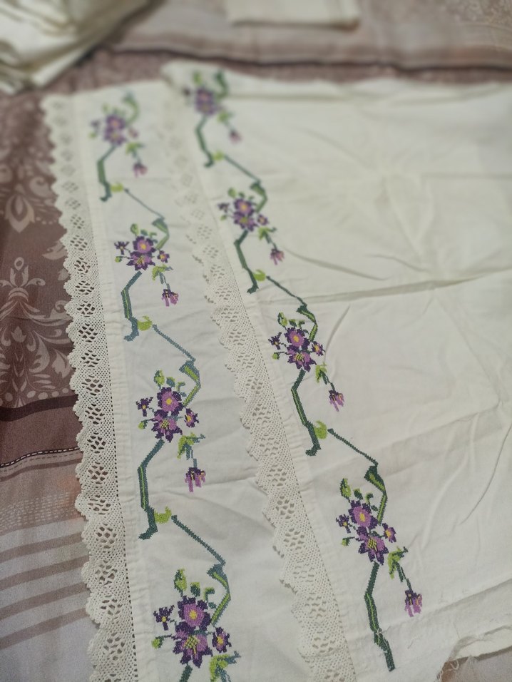 Nakışlı çiçek desenleri ve dantelli kenarlarıyla, mor pastel tonlarda geleneksel masa örtüsü.