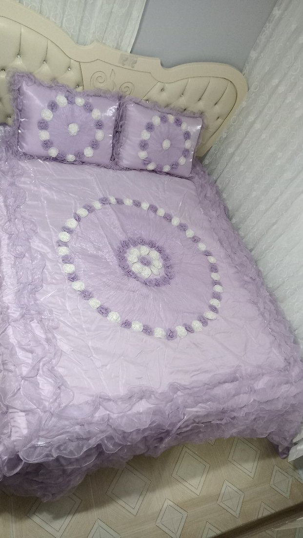 Nakışlı çiçek desenli, yumuşak kumaşlı mor pastel yatak örtüsü ve uyumlu yastık kılıfları.
