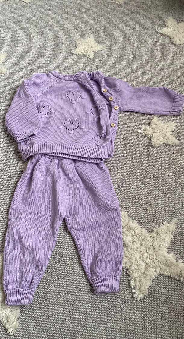 Pastel mor renkte, nakışlı detaylara sahip triko uzun kollu üst ve uyumlu triko pantolondan oluşan bebek kız takımıdır.