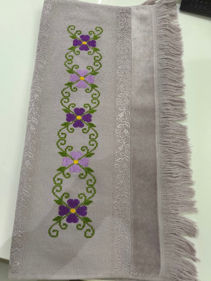 mürdüm renkte, püsküllü kenarlara sahip, mor nakışlı çiçek desenli geleneksel havlu. Hem şık hem kullanışlıdır. etamin işleme