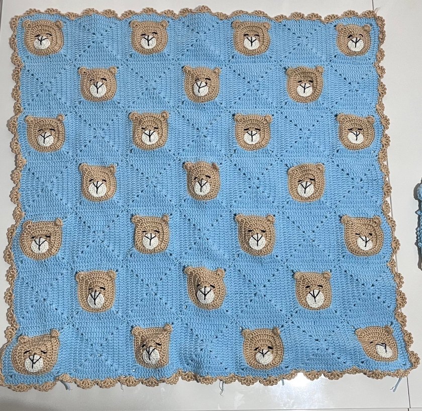 Nakışlı ayıcık desenli, mavi zemin üzerinde renkli örgü bebek battaniyesi. Yumuşak ve rahat dokusu ile çocuklar için uygundur.