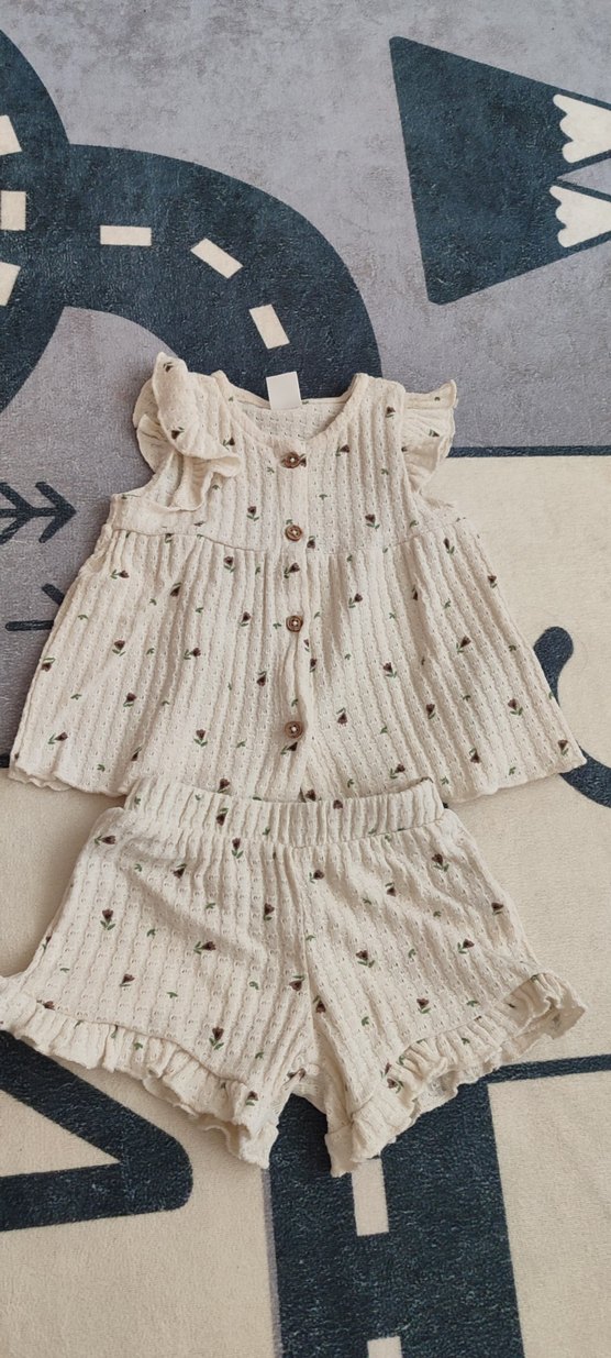 Nakışlı detaylara sahip örgü, beyaz pastel renkli kolsuz bebek kız üstü ve fırfırlı şort takımı.