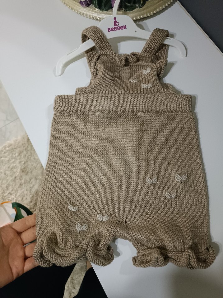 Nakışlı detaylara sahip kahverengi örgü bebek kız tulumu, yumuşak ve rahat bir kullanım sunar.