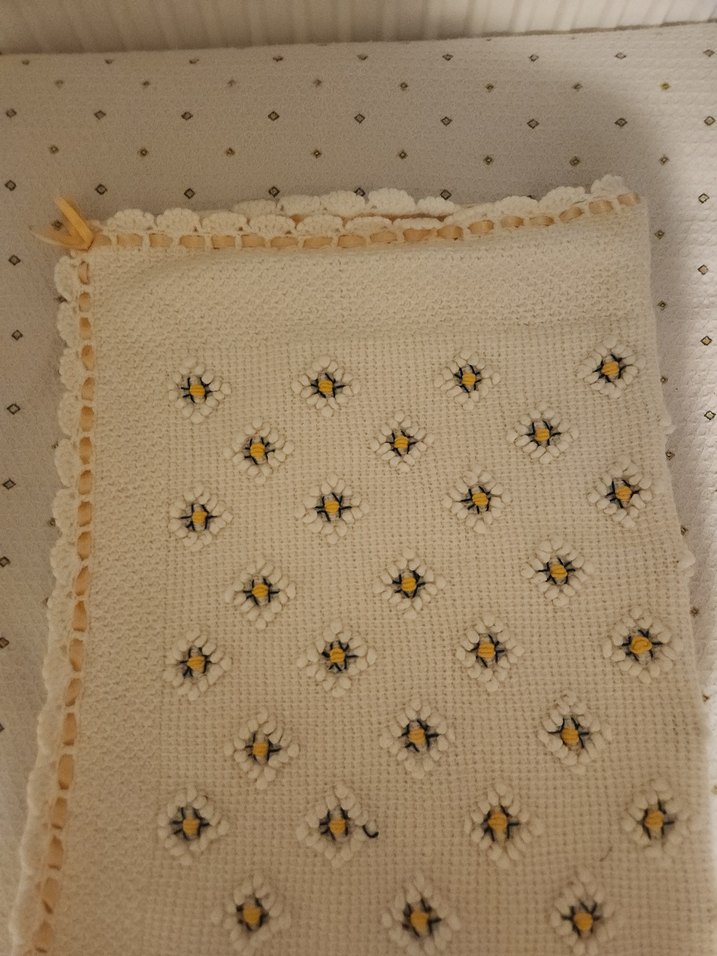 Nakışlı çiçek desenlerine ve ince tığ işi kenarlığa sahip beyaz örgü bebek battaniyesi, çocuklar için yumuşak ve rahat bir dokunuş sunar.
