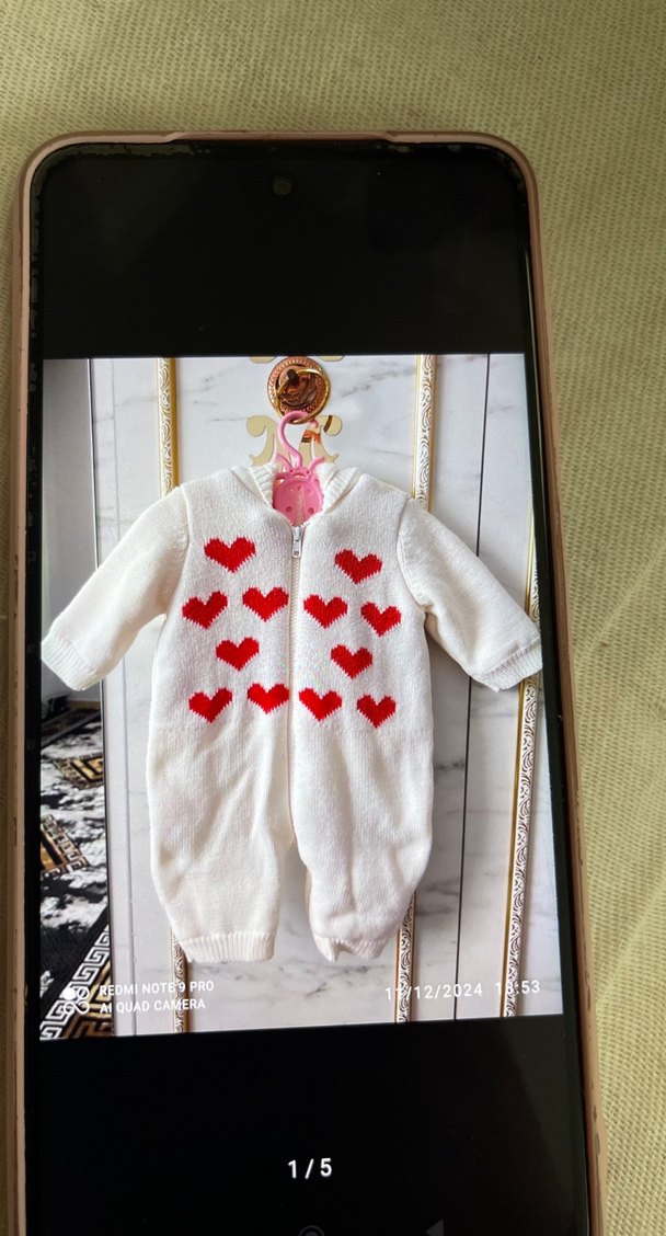 Önü renkli nakışlı kalplerle süslü beyaz örgü bebek tulumu. Kolay giydirme için ön fermuarlı ve uzun kolludur. ❤️