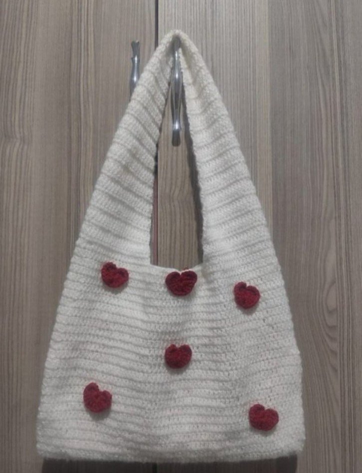 Nakışlı kırmızı kalp detaylı beyaz örgü omuz çantası, rahat ve bohem tarzda. Günlük kullanım için uygundur.