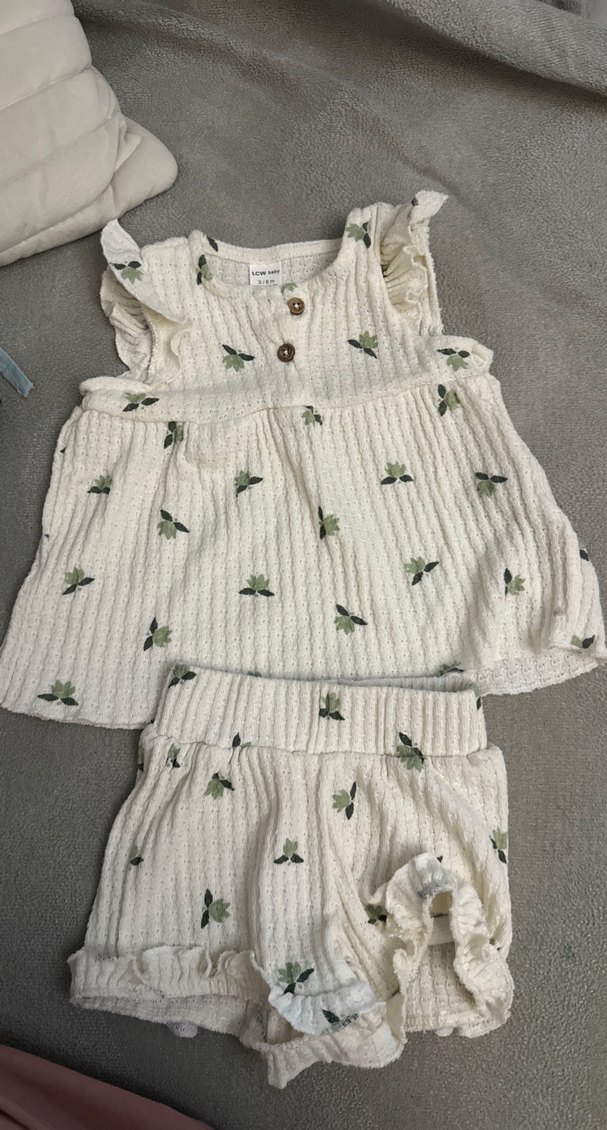 Nakışlı yeşil desenli, düğmeli ve fırfırlı kollu, beyaz örgü bebek kız takımıdır. Hafif ve rahat bir settir.