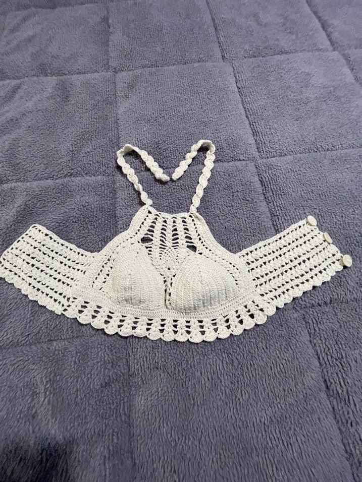 Fitted kesim beyaz örgü mini büstiyer, nakışlı detaylar ve boyundan bağlama ile günlük kullanıma uygun bohem tarzı yansıtıyor. Ayrıca plajda kullanabilirsiniz