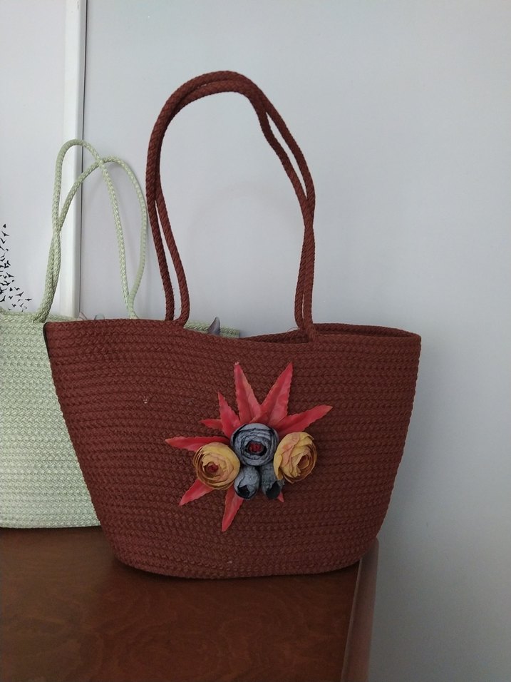 Kahverengi örgü kadın çanta, renkli nakışlı çiçek detayları ve uzun saplarıyla bohem tarzını yansıtıyor.