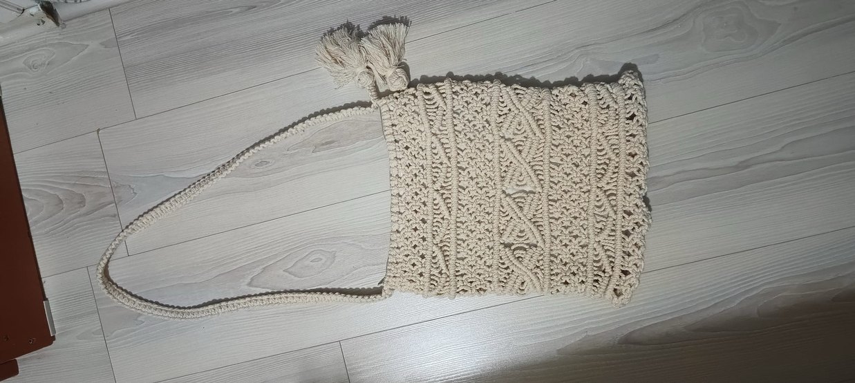 Bej renkte, nakışlı desenlere sahip örgü dokulu bohem tarz kadın çapraz çanta. Günlük kullanıma uygun, yumuşak ve doğal bir his sunar.