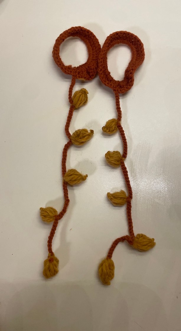 Nakışlı ve örgü detaylı, bej ve hardal renklerinde bohem tarzı kadın el zinciri, açık hava kullanımı için uygun.