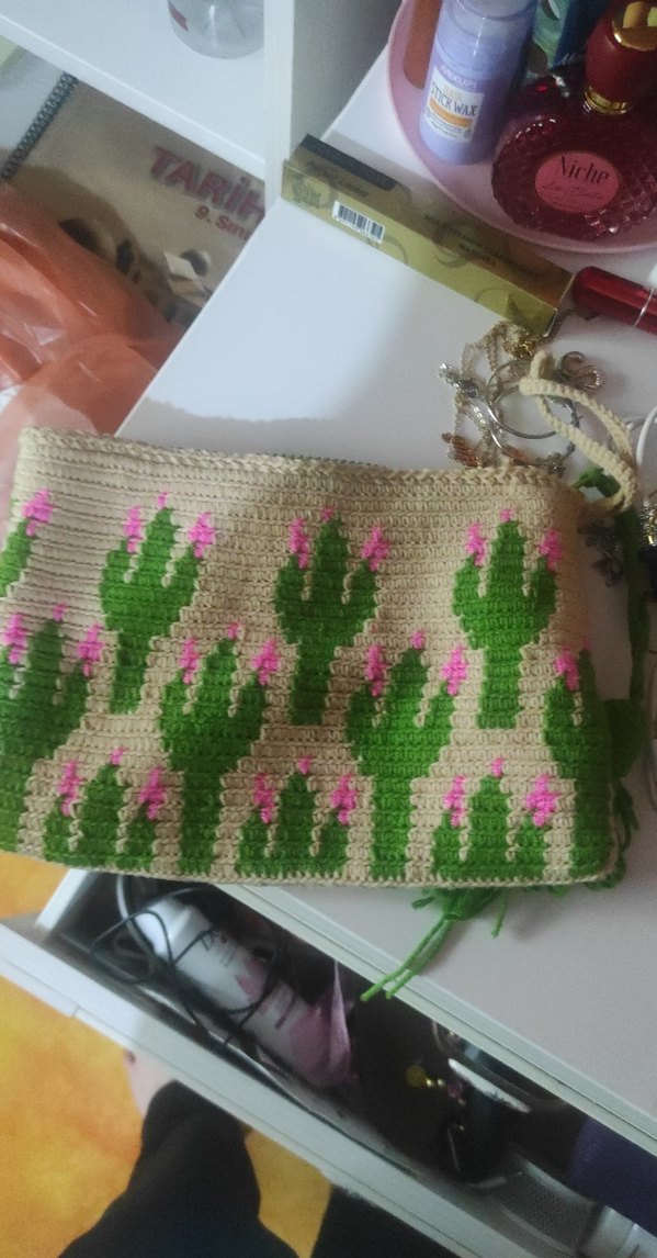 Örgü kumaştan yapılmış, yeşil kaktüs ve pembe nakış desenli bohem tarzda kadın portföy çanta. Hafif ve çok renkli, günlük kullanıma uygun.