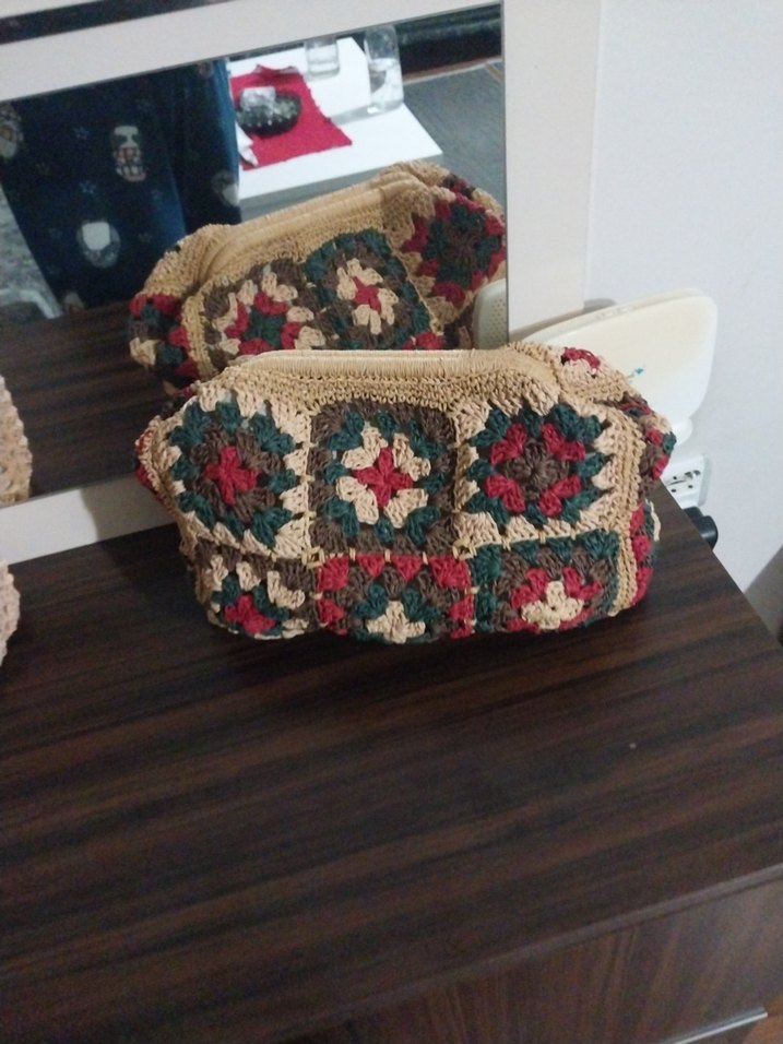 Nakışlı desenlere sahip, koyu çok renkli örgü bohem tarzda kadın portföy çanta. Rahat ve günlük kullanım için uygundur.