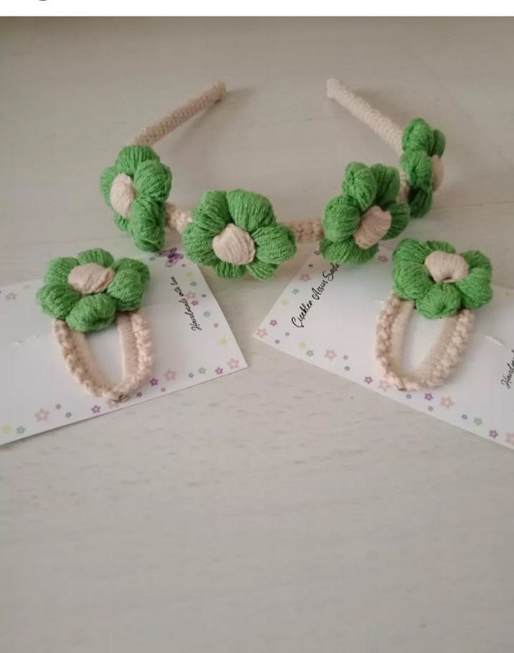 Nakışlı Örgü Çiçekli Yeşil Saç Bandı ve Tokası