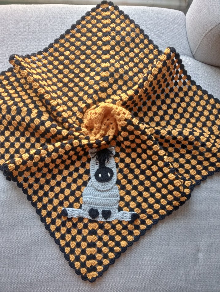 Koyu kamel renkli örgü çocuk battaniyesi, nakışlı zebra deseniyle yumuşak ve rahat bir dokunuş sunar.