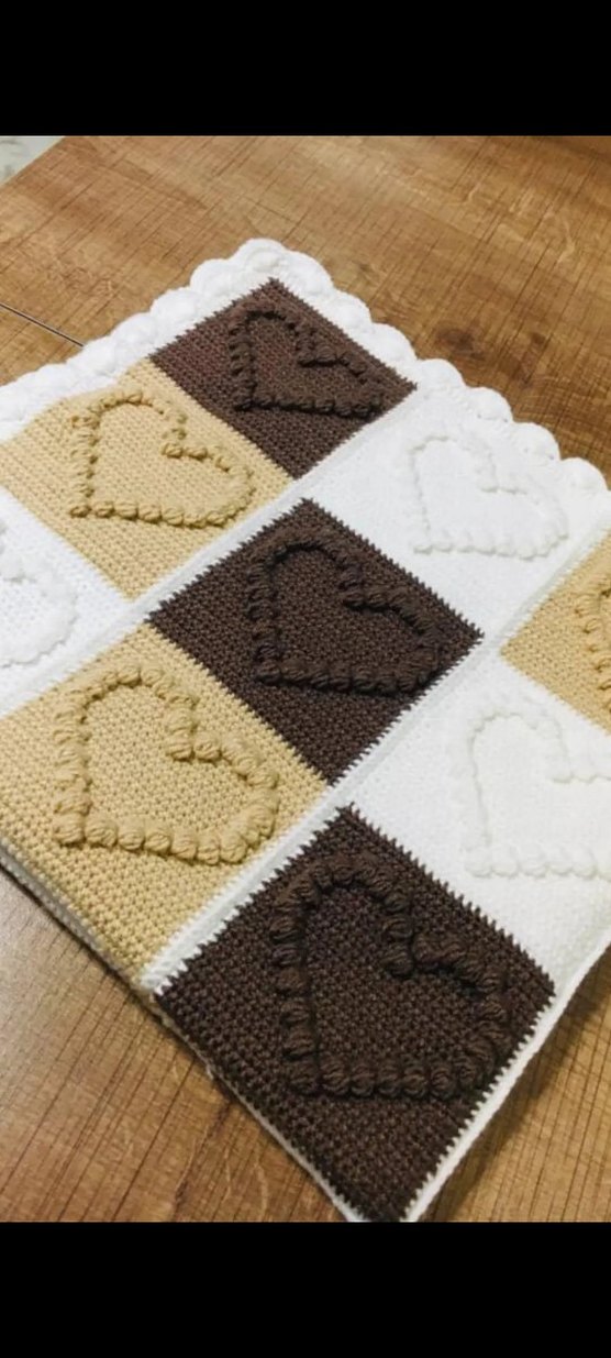 Açık kahverengi örgü çocuk battaniyesi, nakışlı kalp desenleriyle kareler halinde düzenlenmiştir. Yumuşak ve rahat bir yapıya sahiptir.