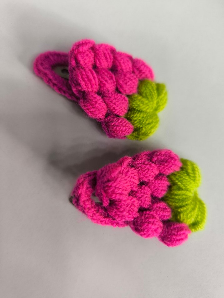 Örgü pembe çocuk saç tokaları, renkli nakış detaylı, modaya uygun ve avangard tarzda tasarlanmıştır.