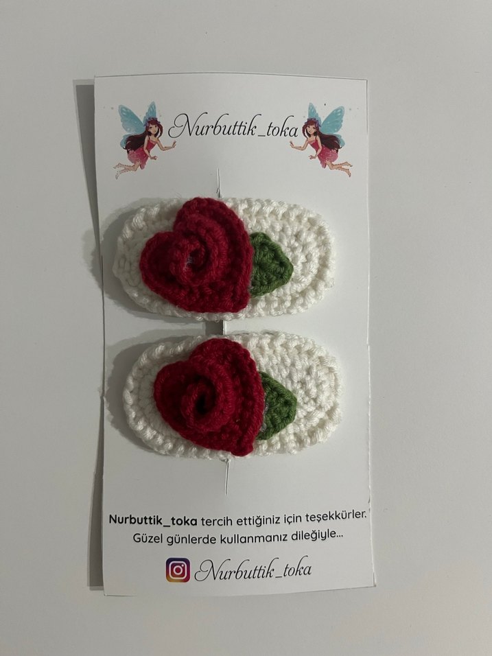 İki adet beyaz örgü çocuk tokası, üzerinde nakışlı kırmızı güller ve yeşil yapraklar bulunur. Hic kullanılmamıs sıfırdır. El emeği göz nuru örgü çıtçıtlı tokadır.✨